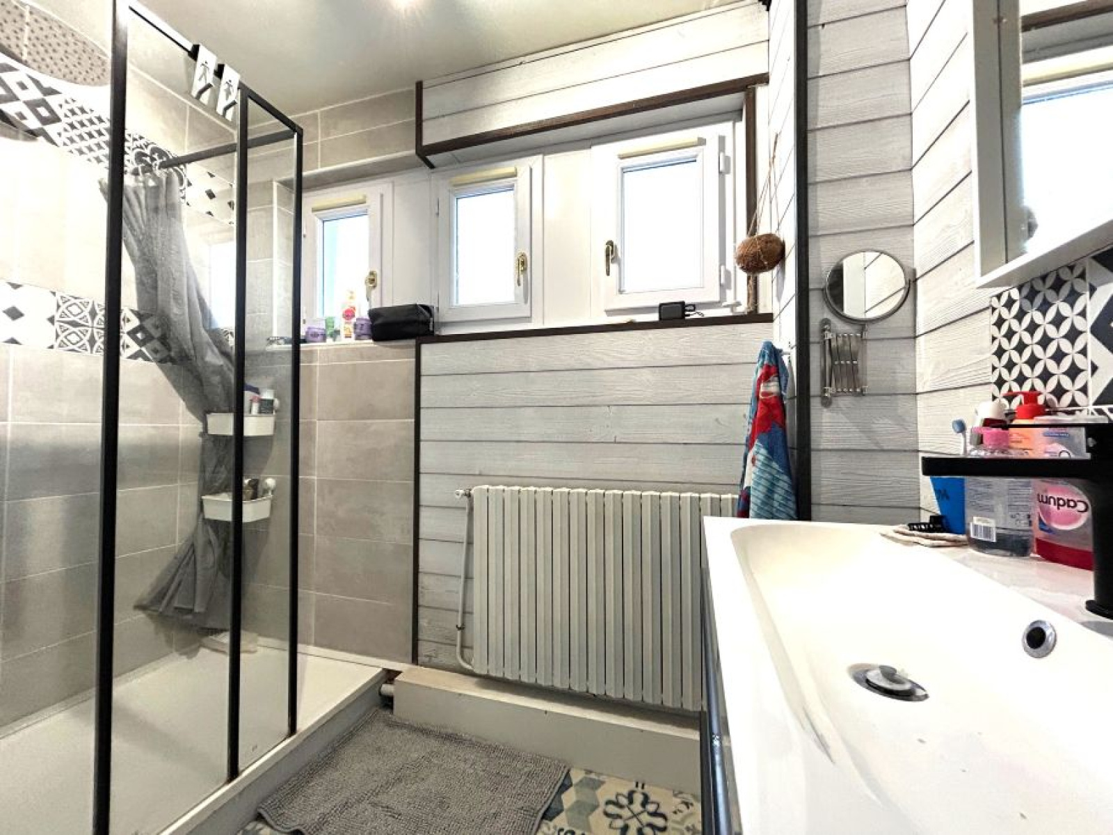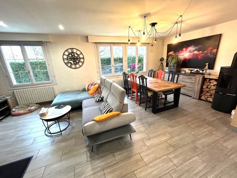 Située dans un secteur prisé, proche des commodités, très bon état pour cette maison semi individuelle développant 94m² environ et bâtie sur une parcelle de 364m². Comprenant : hall d'entrée, WC, cave saine, salon/séjour ouvert sur la cuisine équipée de marque CUISINELLA, le tout pour une superficie totale de 43m² environ halle d'entrée compris, poêle à bois. Buanderie attenante. Au premier ; palier, 3 chambres non mansardées, salle de douche. Combles isolées accessibles par un escalier escamotable. CCgaz de ville, chaudière de 2016, cumulus électrique récent, double vitrage PVC, volets roulants motorisés, tout à l'égout, fibre optique. A l'extérieur : jardin clos et entretenu, terrasse exposée OUEST, carport 1 voiture + parking 1 voiture fermé par un portail, abris bois et abris de jardin/atelier. A visiter !!