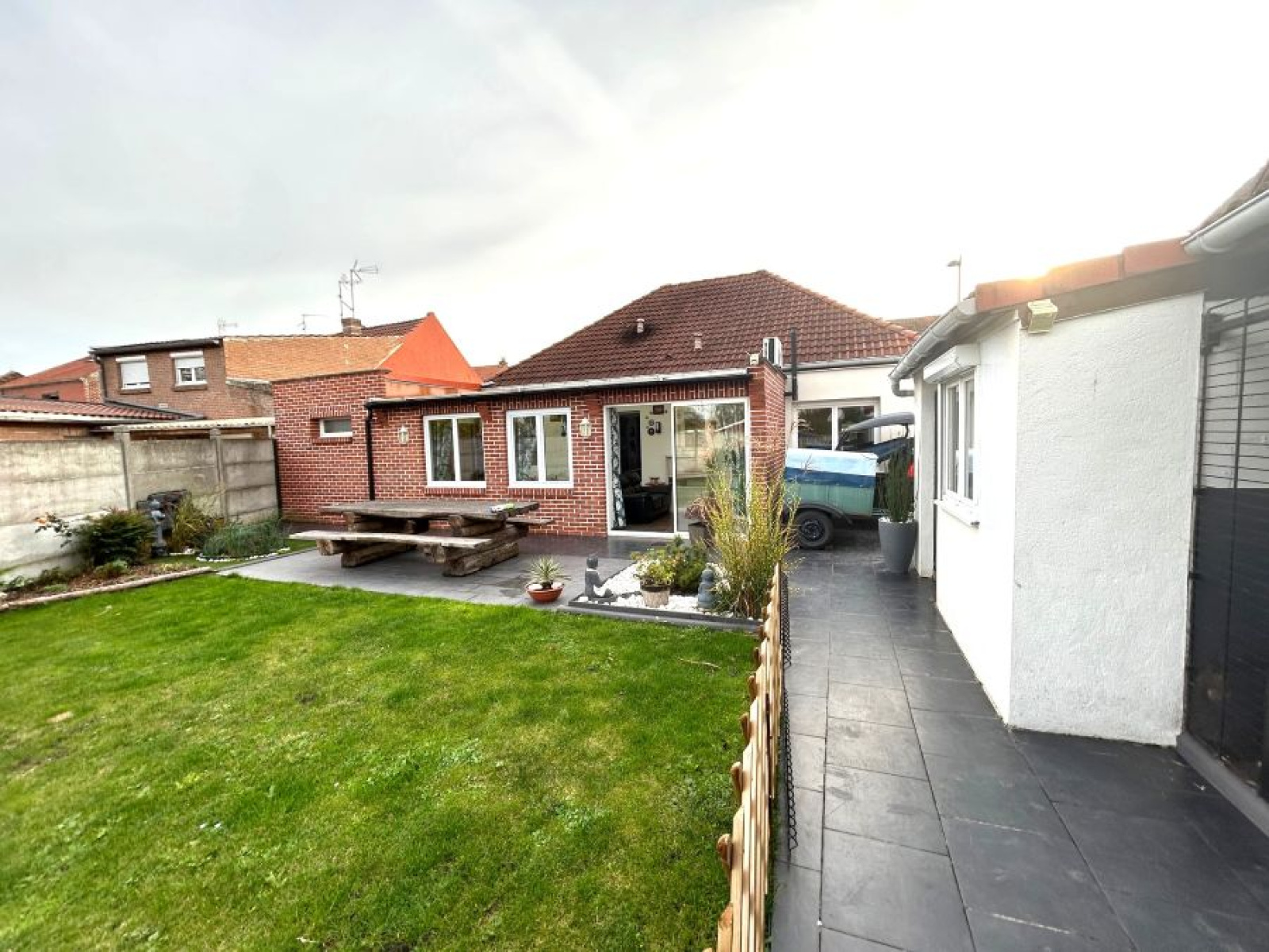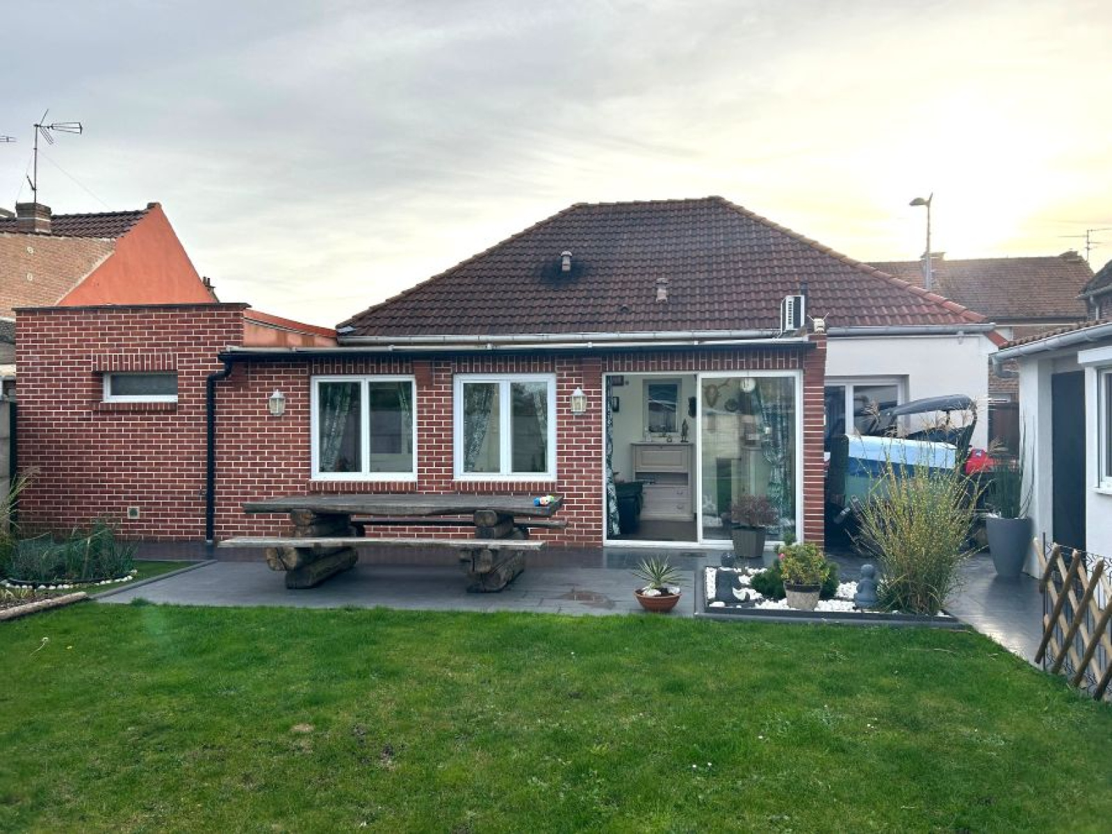 Situé proche des commodités, et des axes, excellent état pour ce plain-pied individuel de 88,34m² bâti sur une parcelle de 472m² !! Comprenant : hall d'entrée, WC, petite chambre, salon/séjour de 26,5m² avec poêle à pellets, cuisine équipée de 11m², véranda de 17m² chauffée par un second poêle à pellets, salle de douche, chambre de 12m² avec climatisation réversible. Buanderie/chaufferie, garage de 18m². Tout l'égout, double vitrage PVC, volets manuels sauf véranda, porte de garage motorisée. A l'extérieur : 2 portails, parking macadamisé 2 voitures, passage côté, terrasse, jardin clos et entretenu, abris de jardin, atelier et chenil. A visiter !! Rare sur le secteur !