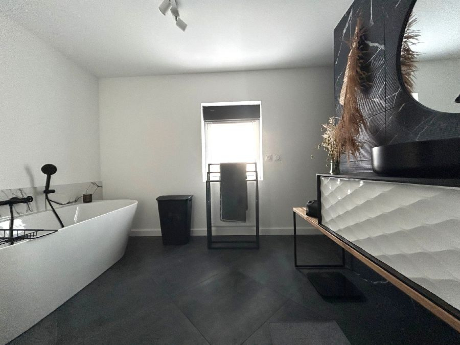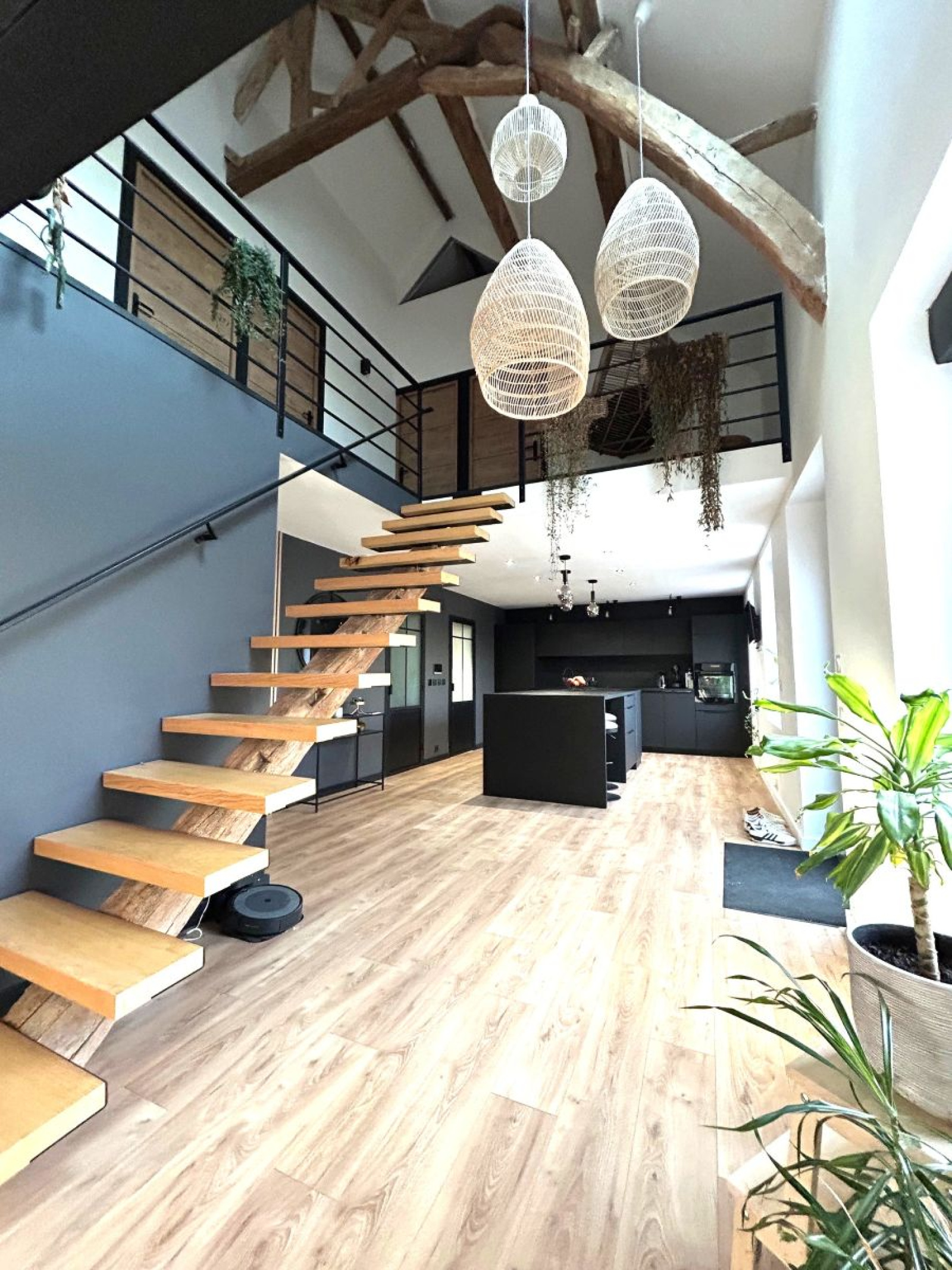 Uniquement en vente dans notre agence. Située en campagne amandinoise, belles prestations et rénovation de qualité pour cette longère individuelle de 178m² de superficie habitable bâtie sur une parcelle de 404m². Comprenant : hall d'entrée cathédrale ouvert sur la cuisine équipée avec ilot central (Cuisinella Belgique) elle même ouverte sur une grande pièce de vie lumineuse avec baie vitrée de plus de 4m donnant sur le jardin, le tout pour une superficie totale de 70m² environ, poêle à pellets 15KW . Cellier/buanderie avec rangements aménagés, cave de 8,6m², salle de bains avec baignoire ilot, meuble vasque et grande douche italienne. WC séparés. A l'étage : palier en mezzanine possibilité espace bureau, salle de douche avec vasque et WC, chambre avec espace mezzanine (couchette ou rangements sous la charpente), seconde chambre, dressing aménagé, grande chambre parentale de 31m² avec espace dressing et hauteur cathédrale. Chauffage électrique + pellets, VMC double flux, double vitrage alu noir sablé, volets roulants électriques, tout à l'égout, fibre optique. A l'extérieur : 2 terrasses, une à l'EST et une à L'OUEST, cour sur l'avant, jardin clos sur l'arrière, accès véhicule, 2 places de parking. A visiter, beaucoup de charme et de cachet, décoration soignée !!