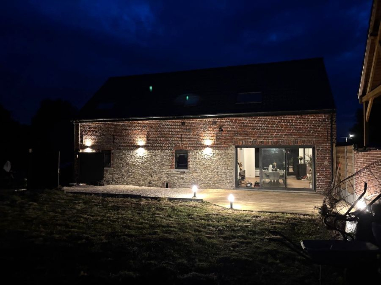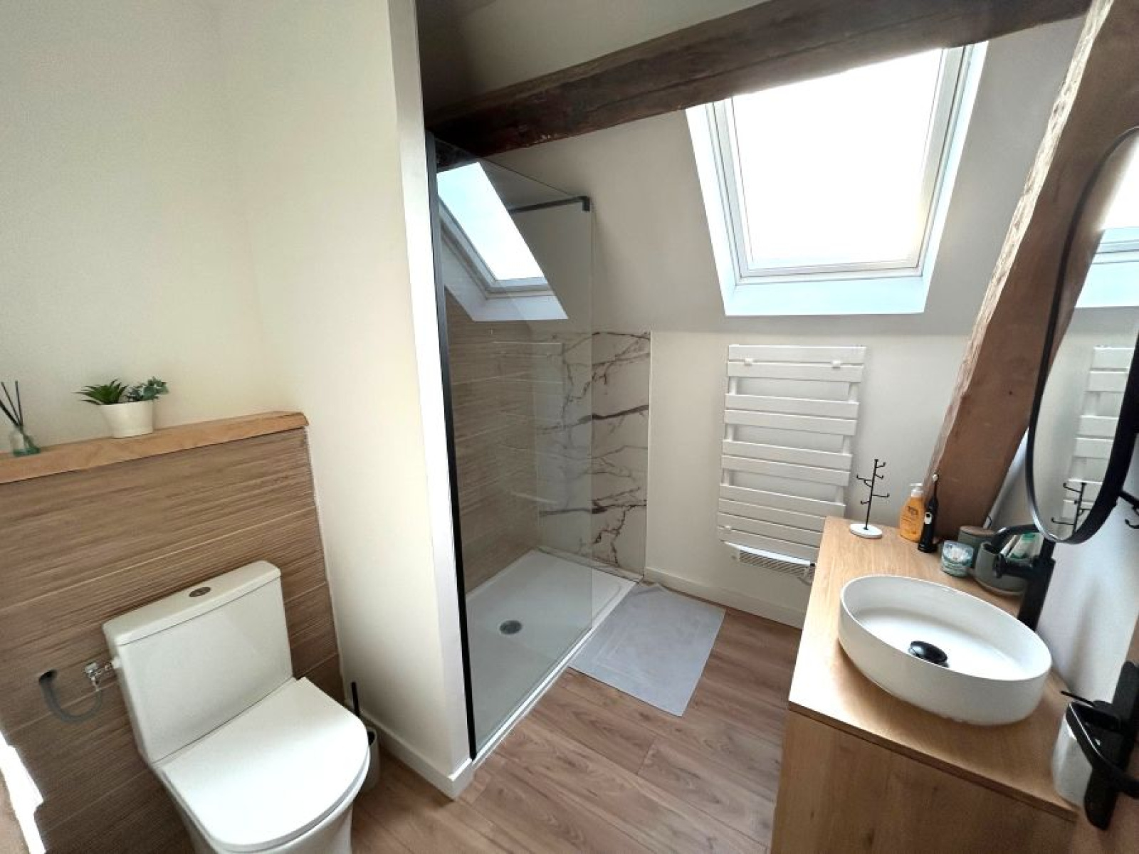 Située en campagne amandinoise, belles prestations et rénovation de qualité pour cette longère individuelle de 178m² de superficie habitable bâtie sur une parcelle de 404m². Comprenant : hall d'entrée cathédrale ouvert sur la cuisine équipée avec ilot central (Cuisinella Belgique) elle même ouverte sur une grande pièce de vie lumineuse avec baie vitrée de plus de 4m donnant sur le jardin, le tout pour une superficie totale de 70m² environ, poêle à pellets 15KW . Cellier/buanderie avec rangements aménagés, cave de 8,6m², salle de bains avec baignoire ilot, meuble vasque et grande douche italienne. WC séparés. A l'étage : palier en mezzanine possibilité espace bureau, salle de douche avec vasque et WC, chambre avec espace mezzanine (couchette ou rangements sous la charpente), seconde chambre, dressing aménagé, grande chambre parentale de 31m² avec espace dressing et hauteur cathédrale. Chauffage électrique + pellets, VMC double flux, double vitrage alu noir sablé, volets roulants électriques, tout à l'égout, fibre optique. A l'extérieur : 2 terrasses, une à l'EST et une à L'OUEST, cour sur l'avant, jardin clos sur l'arrière, accès véhicule, 2 places de parking. A visiter, beaucoup de charme et de cachet, décoration soignée !!