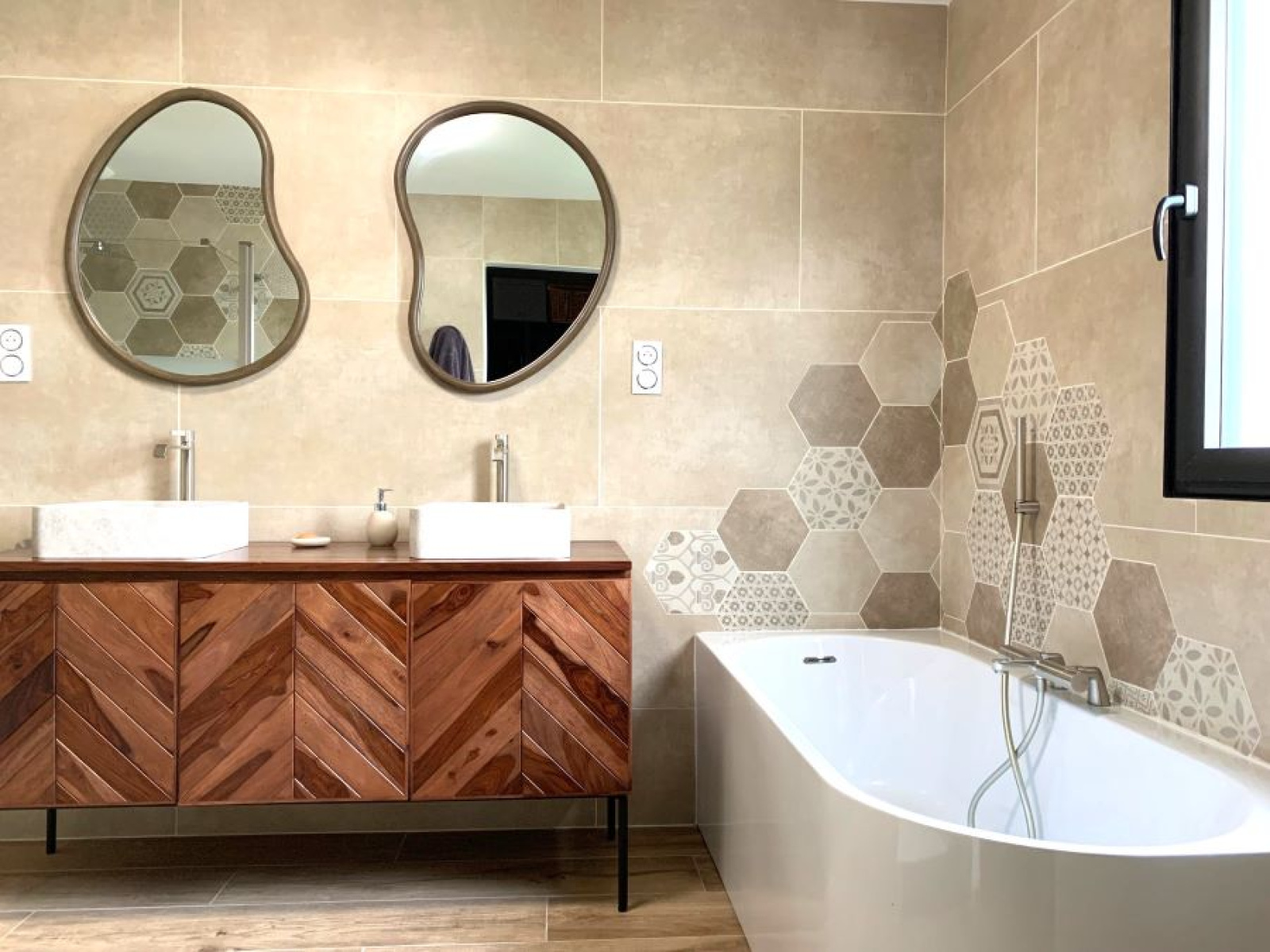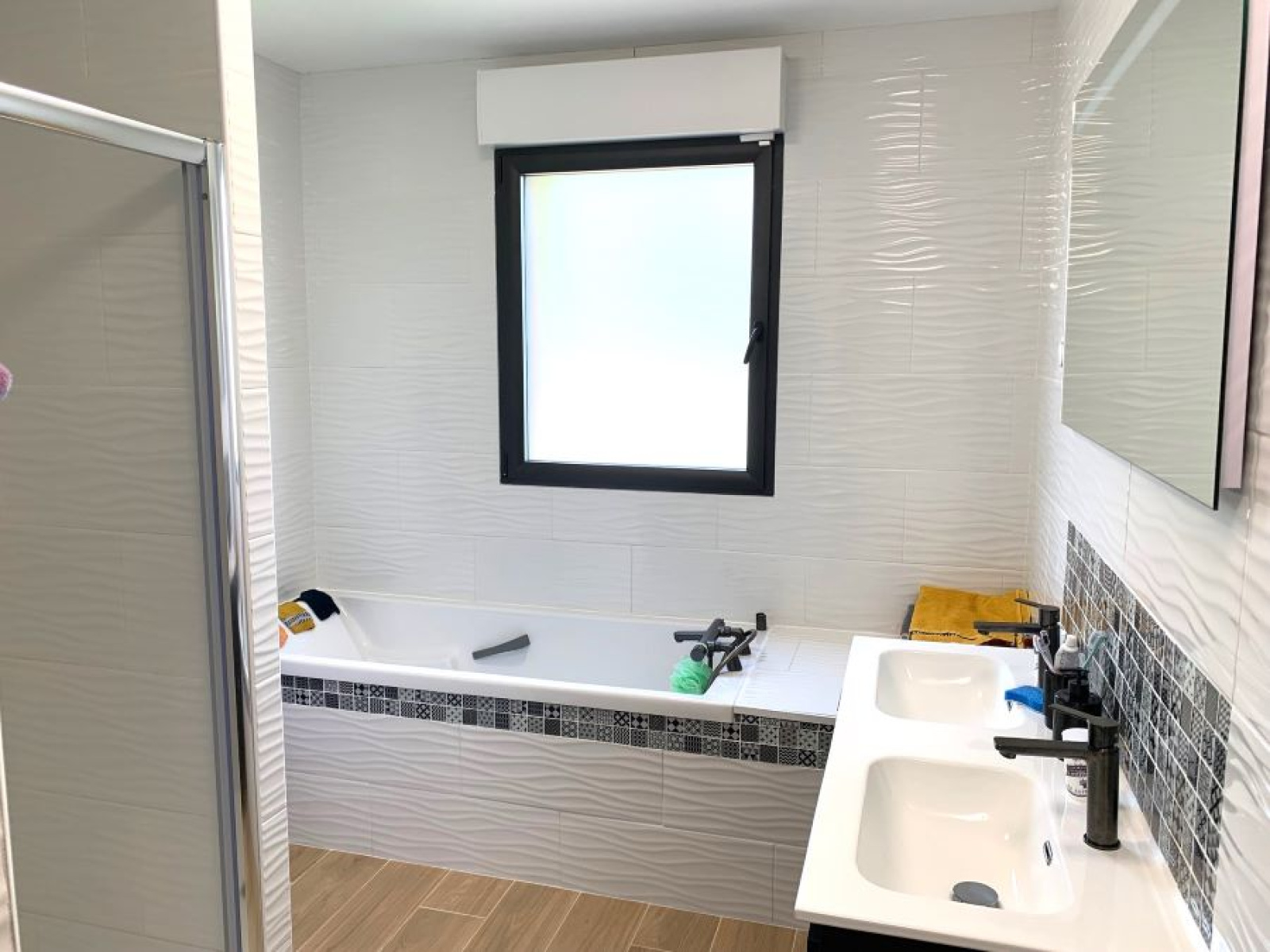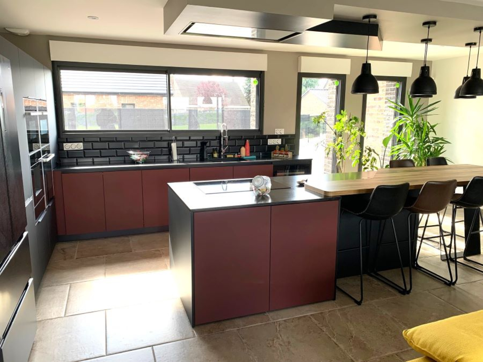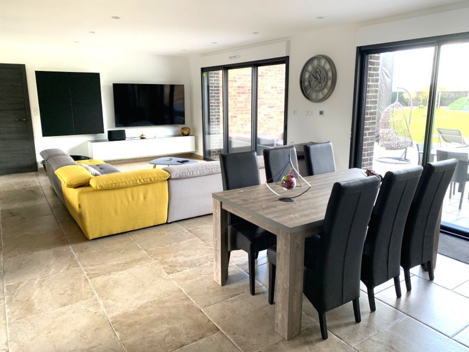 un hall d'entrée semi ouvert sur la pièce de vie pour une superficie totale de 67m² : cuisine entièrement équipée avec ilôt central moderne de marque SCHMIDTT, avec 3 fours, machine à café, cave à vin, électroménager de qualité (neff ...) hotte intégrée au plafond etc.. donnant sur le salon/séjour baigné de lumière avec grandes baies vitrées donnant sur la terrasse et la piscine. un grand cellier/buanderie de 15m² un garage double de 40m² avec porte large motorisée un espace suite parentale séparé des autres chambres comprenant : dégagement, dressing aménagé, salle de bains avec baignoire, vasque, douche et WC suspendus (Geberit), espace chambre avec baie donnant sur la terrasse de l'autre côté de la maison : WC suspendus (Geberit) séparés avec lave-mains, salle de bains avec baignoire, vasque et douche, 3 chambres spacieuses de 14 /14 et 16m² chacune avec placards aménagés.Concernant les équipements de la maison : cette dernière dispose de domotique pour les volets et les lumières extérieures, centralisation pour les volets, chauffage par le sol par pompe à chaleur (DAIKIN), adoucisseur d'eau, fibre, cuve de récupération des eaux de pluie de 10 000L alimentant les WC et les machines, tout à l'égout, double vitrage aluminium.